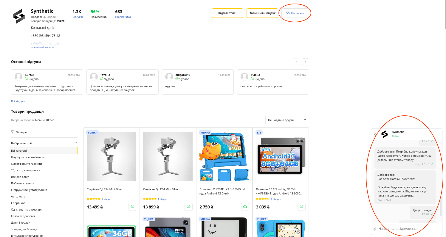 Маркетплейс Synthetic.ua надає декілька способів зв’язку з продавцем для уточнення інформації щодо товару, умов доставки або оформлення замовлення.